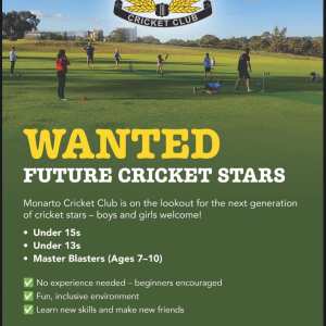Monarto Cricket Club Under 15’s Monarto Cricket Club is putting a call out to anyone between the ages of 12 and 15 who might be... 26 Mar 4:30 pm - 6:00 pm