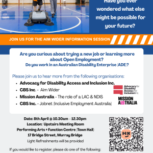 The information session organized by CBS Inc. (Aim Wider) on Wednesday 8 April from 1030am-1230pm at Town Hall, Murray Bridge....
