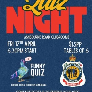 Strathalbyn and Districts RSL Sub Branch Trivia Night A Trivia night compared by Funny Quiz. 12 tables of 6 people Door prize, table prizes each round, raffles 17 Apr 6:00 pm - 11:00 pm Strathalbyn and Districts RSL Sub Branch Ashbourne Road, Strathalbyn