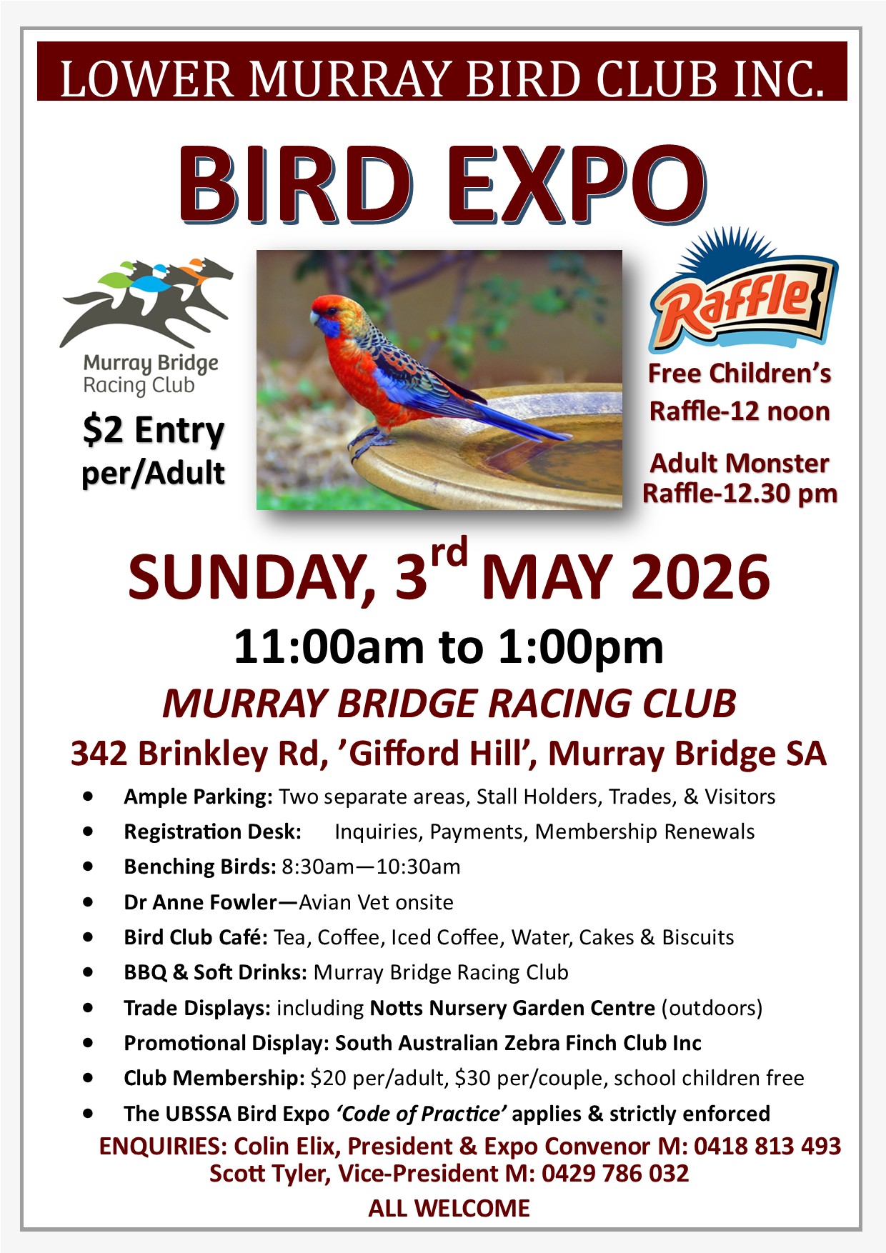 The Lower Murray Bird Club is pleased to announce its annual Bird Expo, to be held on Sunday 3 May 2026 at the Murray Bridge Racing Club, 342 Brinkley Road, Gifford Hill, from 11:00am to 1:00pm.