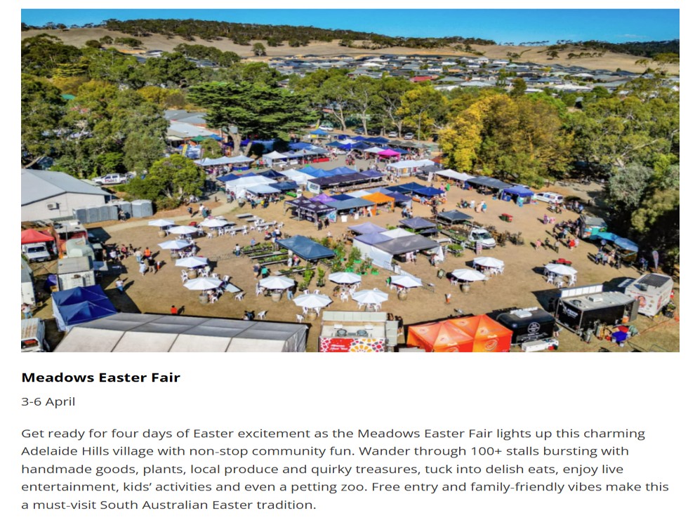 Get ready for four days of Easter excitement as the Meadows Easter Fair lights up this charming Adelaide Hills village with non-stop Community fun.