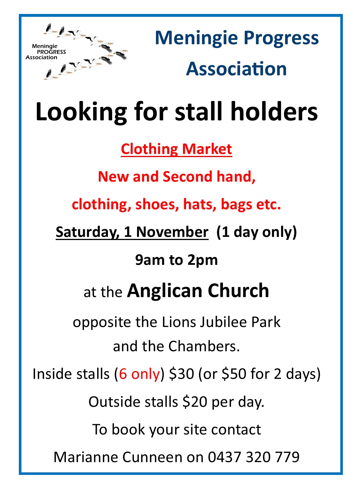 A market for new and second hand clothes, shoes, hats, jewellery and bags etc will be held at the Meningie Anglican Church, Princes Highway, Meningie, on Saturday, 1 November.