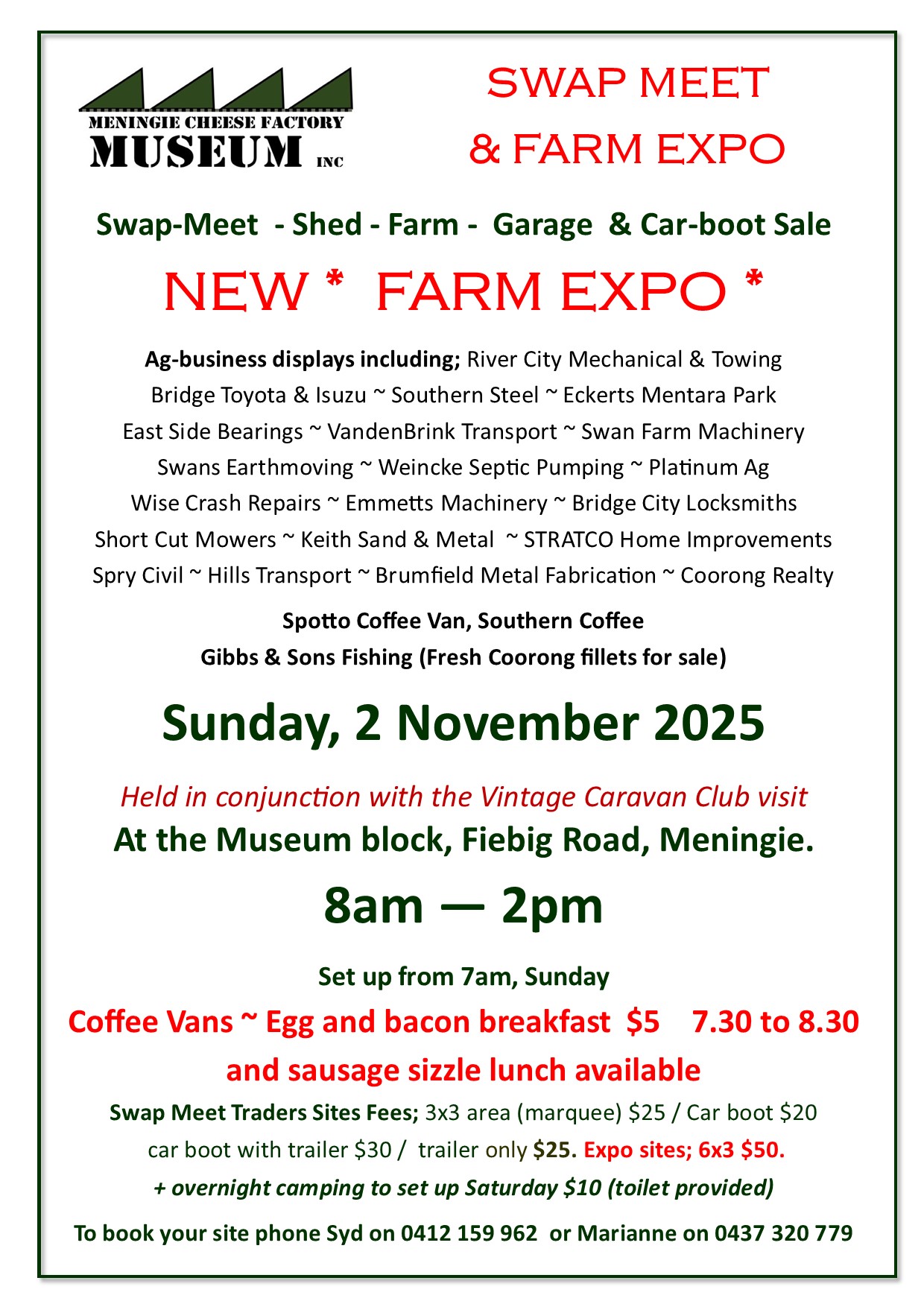 The Meningie Swap meet and Farm Expo will be held at the Meningie Museum block on Fiebig Road/Narrung Road, Meningie.