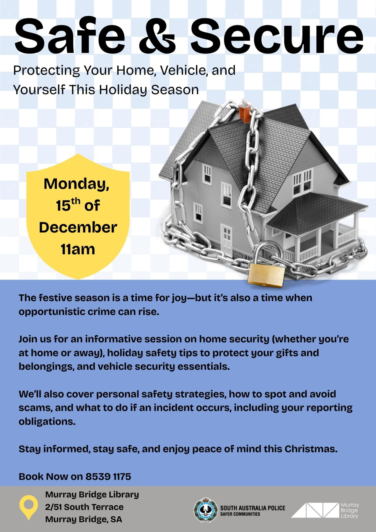 Safe & Secure – this Holiday Season Back to Community Events Advertisement Date Dec 15 2025 Expired! Time 11:00 am Location Murray Bridge Library Level 2 Murray Bridge Market Place, 51 South Tce
