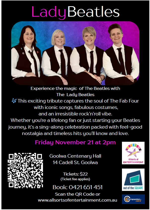 The Lady Beatles – Fab 4 Back to Community Events Advertisement Date Nov 21 2025 Time 2:00 pm Cost $22 +fee Location Goolwa Centenary Hall 14 Cadell Street, Goolwa