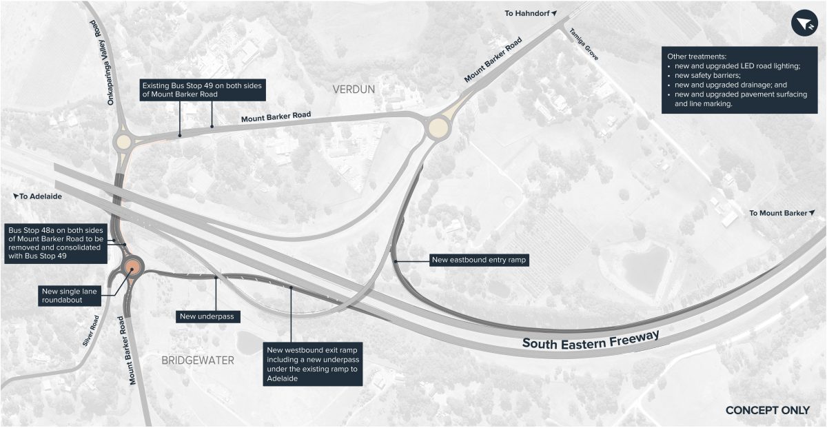 Currently, there is no exit ramp for drivers travelling from Mount Barker to Hahndorf, and no entry ramp for eastbound motorists. The upgrade will include a new eastbound entry ramp towards Mount Barker and a new westbound exit ramp connecting to a roundabout at the junction of Mount Barker Road and Silver Road.